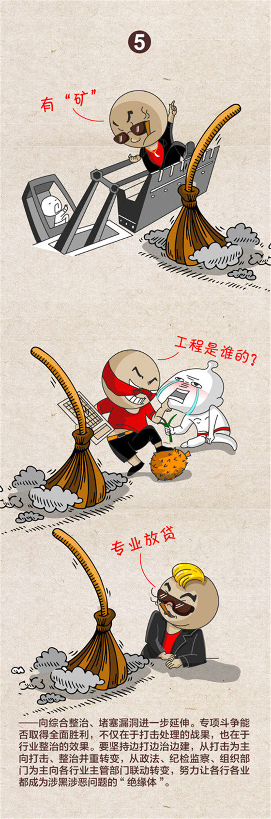 中央紀委國家監(jiān)委網(wǎng)站近日發(fā)布一組題為《2019掃黑除惡“六個延伸”》的漫畫,對2019年掃黑除惡專項斗爭提出向偵破大案、打財斷血進一步延伸,向網(wǎng)絡(luò)空間、新興領(lǐng)域進一步延伸,向深挖幕后、打傘破網(wǎng)進一步延伸,向依法懲治、快訴快判進一步延伸,向綜合整治、堵塞漏洞進一步延伸,向固本強基、鏟除土壤進一步延伸等六大方向。