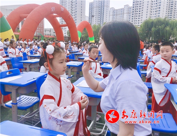 開筆禮儀式在博物館司儀老師的主持下,14名班主任教師、732名新生,身著漢服精神抖擻地進入“啟蒙門”,有序進行正衣冠、拜孔子、朱砂啟智、擊鼓明智、啟蒙描紅等體驗活動,領導嘉賓和老師們俯身參與其中,和孩子們同心同樂,共同見證開筆禮的神圣時刻。在“時光信箱”環(huán)節(jié),家長代表們身著卡通道具服,手持“時光信箱”環(huán)游操場一周,收集所有爸爸媽媽對孩子的期盼和祝福,此時孩子們歡呼雀躍,好不熱鬧,操場頓時變成了歡樂的海洋。