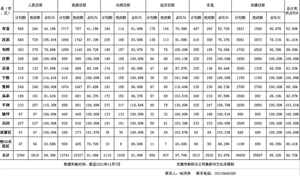 截至2021年12月7日,全市重點黨報黨刊完成量占下達(dá)計劃數(shù)的84.72%。征訂情況為:寧陜縣104.85%,平利縣103.51%,高新區(qū)100.86%,鎮(zhèn)坪縣100.06%,漢陰縣100.05%,白河縣100.05%,紫陽縣99.36%,旬陽市88.06%,漢濱區(qū)81.41%,恒口示范區(qū)80.41%,嵐皋縣62.97%,市直各單位52.99%。其中,寧陜縣、平利縣、高新區(qū)、鎮(zhèn)坪縣、漢陰縣、白河縣,措施有力,率先完成2022年度征訂任務(wù)。