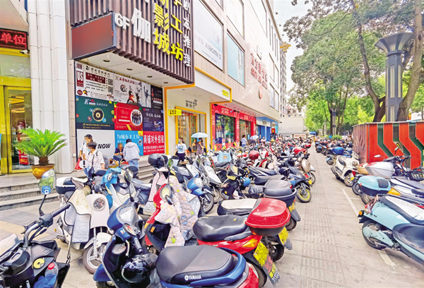 6月18日,在安康城區(qū)金州南路人行道上,部分車輛占用盲道、車身超出停車線(圖1),未按要求停放車輛(圖2),造成了安全隱患。(記者 張喬 攝)