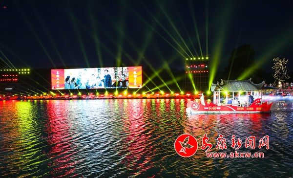 晚會(huì)在嘹亮激昂的獨(dú)唱《東方紅》中拉開(kāi)序幕,緊接著,磅礴大氣的歌舞串燒《我和我的祖國(guó)》《萬(wàn)疆》《愛(ài)我中華》,如詩(shī)如畫的水上表演《南湖紅船》《江南水鄉(xiāng)》《滾滾長(zhǎng)江東逝水》,動(dòng)力澎湃的RAP時(shí)尚秀《門戶新安康》,美輪美奐歌舞表演《我的深情為你守候》《為祖國(guó)干杯》《送你一個(gè)長(zhǎng)安》《我愛(ài)你,中國(guó)》《領(lǐng)航》等節(jié)目相繼登臺(tái)表演,與此同時(shí),絢麗多彩的燈光秀和仙氣飄飄的霧森特效穿插其中,不斷將演出推向高潮。最后,整場(chǎng)演出在大合唱《沒(méi)有共產(chǎn)黨就沒(méi)有新中國(guó)》的歌聲中圓滿落下帷幕。
