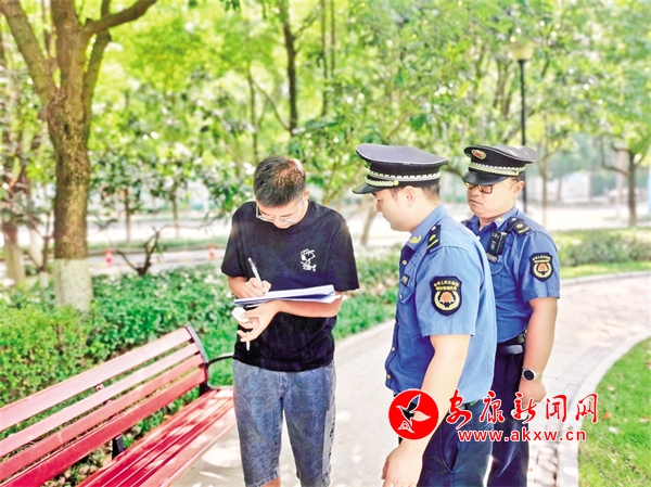 連日來,漢濱區(qū)、高新區(qū)城管部門在中心城區(qū)全域持續(xù)開展“文明有我 痰吐文雅”專項(xiàng)糾治執(zhí)法行動。城管執(zhí)法人員依據(jù)規(guī)定,對“隨地吐痰”等不文明行為人,處以十元以上五十元以下的罰款,或以發(fā)朋友圈集贊的方式接受柔性執(zhí)法免于罰款。據(jù)統(tǒng)計,截至9月6日,已開展現(xiàn)場處罰258人次,其中開具罰單62張。圖為隨地吐痰的市民正在接受行政處罰。屈明佳 攝