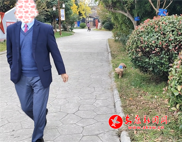 11月8日下午,興安公園小廣場內(nèi)有市民遛狗未牽繩,寵物犬綠地隨意便溺。(圖文/周薇)