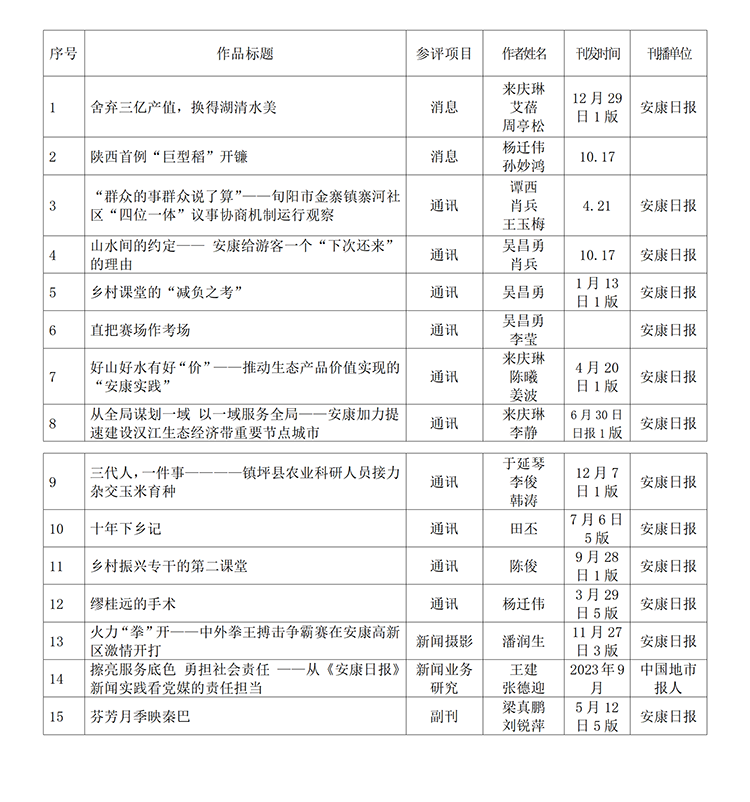 經(jīng)過1月30日編委會推薦、社黨委研究決定,擬推薦以下15件新聞作品參評2023年度“陜西新聞獎”。公示時間從2024年1月31日至2024年2月5日,公示期為5個工作日。如有不同意見,請向安康日報(bào)社機(jī)關(guān)紀(jì)委、新聞管理部反映。