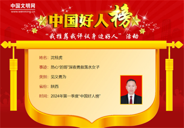 4月18日,2024年第一季度“中國好人榜”發(fā)布儀式暨全國道德模范與身邊好人現(xiàn)場交流活動,在江西省九江市舉辦。我市沈桂虎光榮上榜。