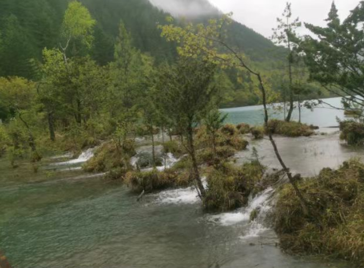 杯口群峰環(huán)繞松柏聳翠,原始森林擁抱一池碧水,身后便是巖崖冷峻的雪山。雪水從雪山流下匯于長(zhǎng)海,碩大的堰塞湖,四季豐盈,萬年不枯。調(diào)節(jié)的方式就是順石巖裂縫向下滲透,沿杯壁而下,就衍生了一串造型各異,變化多樣的瀑布和湖泊,如藏族姑娘項(xiàng)鏈上的珍珠。九寨溝的水本無奇異,只因地理之變,環(huán)境相殊,山光幻化,將一串串珍珠點(diǎn)染得五彩斑斕,美不勝收。
