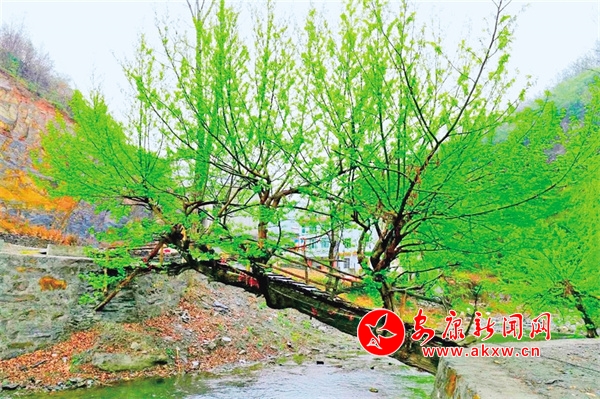 四十多年前,一場百年不遇的洪災,沖壞堤坎,毀了樹木,襲了田地,河灘一片狼藉。這棵老柳,根部的土石被洪水沖刷得所剩無幾,沒有泥土的支撐樹干緩緩傾斜,晃悠了一天一夜,頭部漸漸地搭到了東岸堤坎。次日清晨,河東有人發(fā)現(xiàn)了,立即喊上四五個小伙子,從樹身爬過,去西岸救人、查災。緊接著,兩岸的人們爭相過河到對岸去救災、救苗,又陸續(xù)過河修路、種地,進而過河上學、出山,一連數(shù)月都從樹身爬過,把這樹干當作橋身,你來我往地通行于兩岸。于是,這道天然“樹橋”,既凝聚了生產救災力量傳遞了兩岸情感,又溝通了人流、物流、信息流。