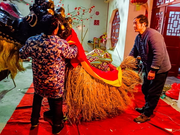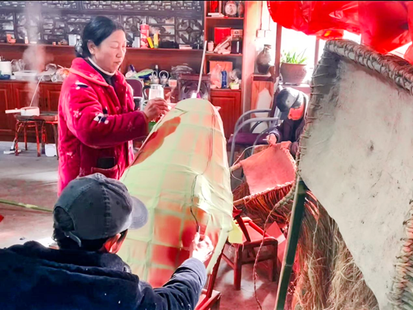 “龍頭是整條龍的重點,刻畫要逼真,色彩還得鮮艷。忙碌了一年的鄉(xiāng)親們,就希望在正月里,抖擻精神,舞動起來?!闭f話間,李忠寶一雙巧手上下翻飛,正在修剪龍頭花燈的胡須,忙得額頭沁出了汗珠。兒子李石磊則忙著幫烤、粘、填、糊、上色……在他們父子倆的精雕細(xì)琢下,一個威風(fēng)凜凜、栩栩如生的花燈道具龍頭,總算扎制完成。