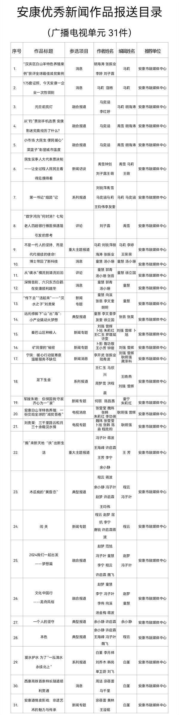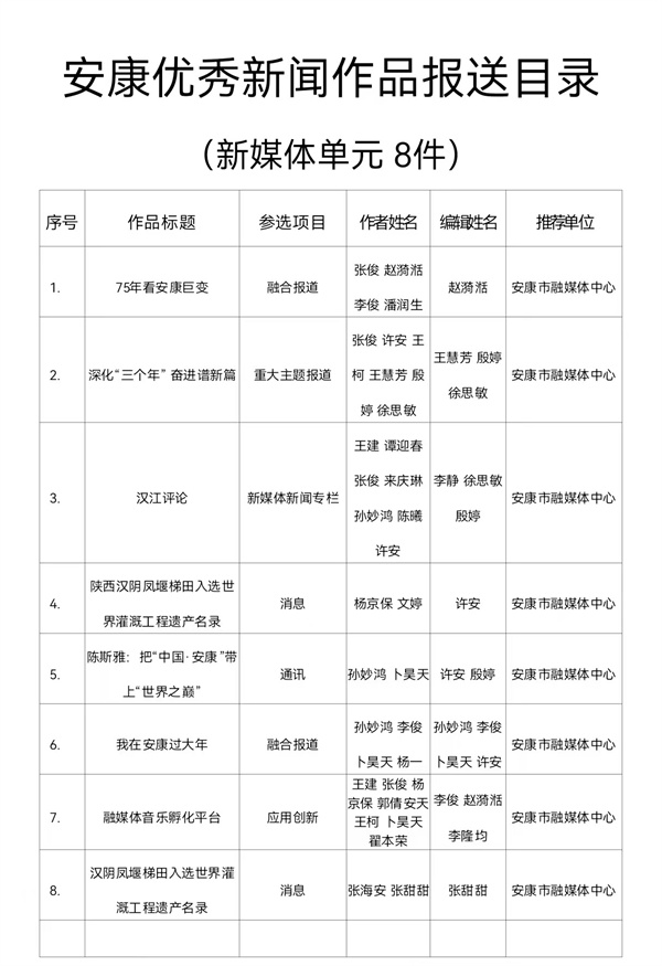 根據(jù)《關于開展2024年度安康優(yōu)秀新聞作品、安康市優(yōu)秀新聞工作者推選工作的通知》(安記協(xié)〔2025〕04號)文件要求,經(jīng)推薦、領導審核,安康市融媒體中心推薦參評2024年度安康優(yōu)秀新聞作品97件(報紙單元58件,廣播電視單元31件,新媒體單元8件)。現(xiàn)將報送作品目錄(詳見附件)予以公示。