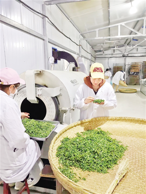 沿著九曲山路攀至絲鋪村五龍山,1200米的海拔高地,500畝生態(tài)茶園豁然舒展在眼前。茶農(nóng)們星羅棋布地穿梭在茶園,夏茶葉紛紛從茶樹間跌落?!案呱讲杌馗首?,這片云海就是天然保鮮庫(kù)?!贝逯Р繒洸碳椅妮p捻茶葉,陣陣清香沁人心脾。旬陽(yáng)五龍山農(nóng)民種植專業(yè)合作社負(fù)責(zé)人王志富打開茶廠卷簾門,生產(chǎn)線熱氣蒸騰?!叭ツ晡覀兪召?gòu)了3000公斤鮮葉,加工了1000公斤干茶,產(chǎn)值達(dá)到30萬元,輻射帶動(dòng)周邊村民端穩(wěn)飯碗?!?/p>