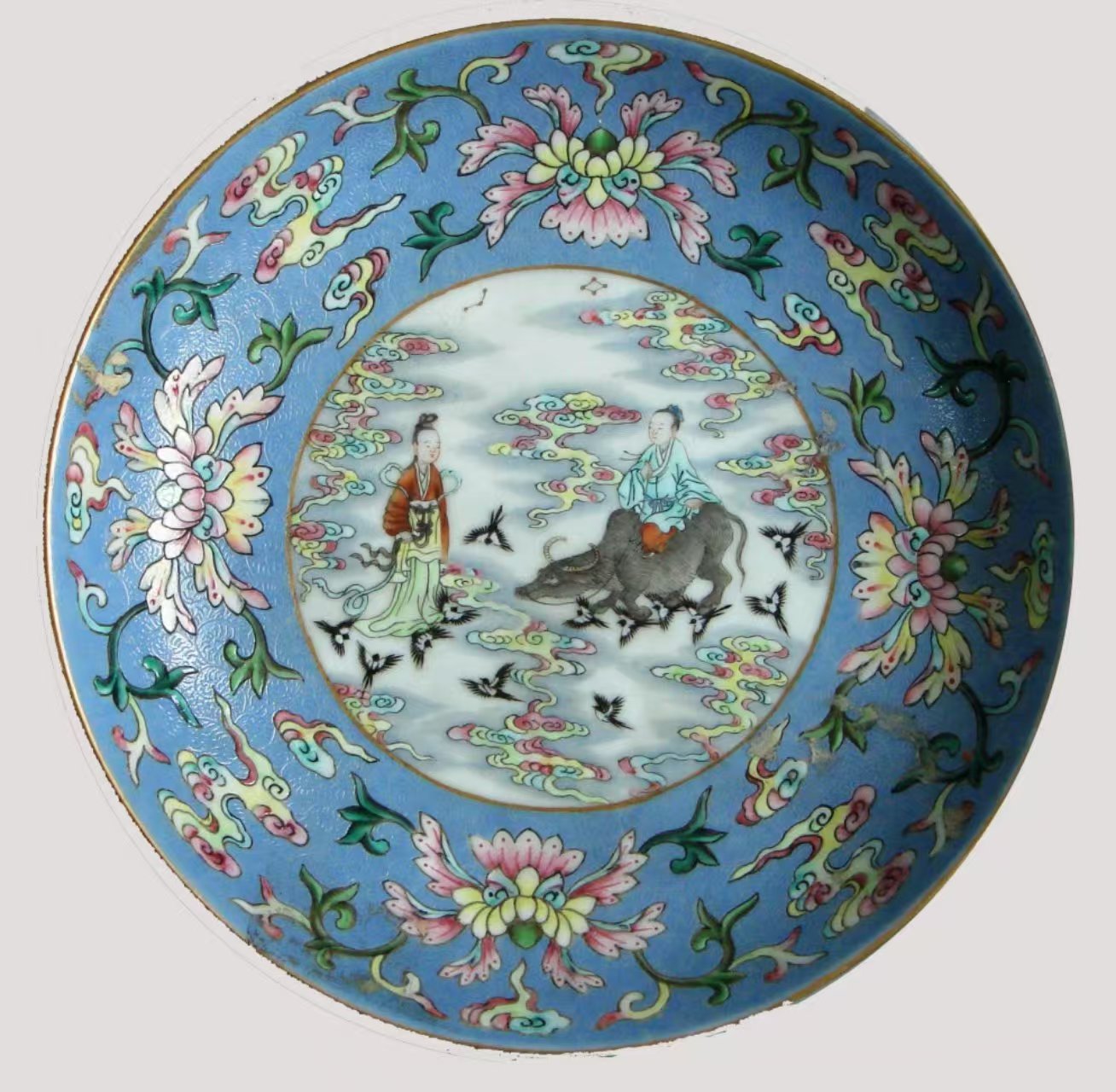 北京藝術(shù)博物館收藏的清代景德鎮(zhèn)官窯粉彩人物圖盤,就像一幅流動的七夕畫卷。此盤工藝精湛,口沿涂金,熠熠生輝,盡顯皇家氣派。盤內(nèi)外壁采用“粉彩軋道”工藝,天藍釉地上淺淺的卷草紋似微風(fēng)輕拂,粉彩花卉與朵云紋相互映襯,如夢如幻。盤內(nèi)底描金圓形開光處,粉彩繪就的人物故事圖案更為生動:牛郎坐于牛背,手握韁繩,深情凝望;織女身姿婀娜,嬌羞回望,二人似在互訴衷腸。背景中祥云繚繞、星辰閃爍、鵲鳥紛飛,為這場相會營造了浪漫的氛圍。外底“鵲橋仙渡”四字,點明主題。