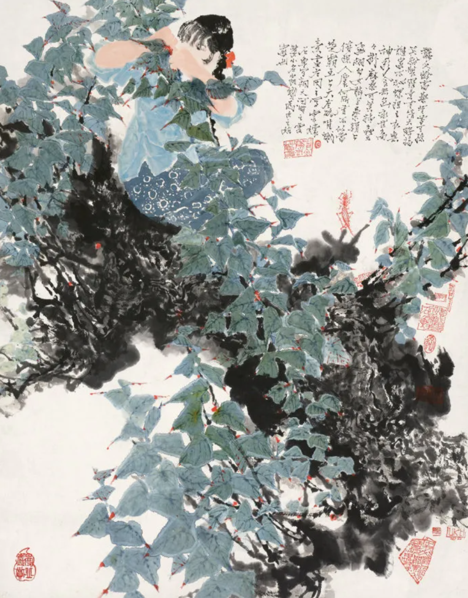 題識:蠶女齡喬桑,昔有王孫笑粉妝。羅素有情天降福,誰家不秘王祖。衣無神采食無魚,永世商裔掛麻桑??尚γ尴x無飛翅,白女敢上桑顛上。俯視人寰何所有,不似當(年)楚霸王。上天有路唯蛾素,畫者因之寫云。石魯寫朝天河畔之云婆,小名安蛾,為女之姑家也。《采桑圖》,2010春拍成交價1064萬元。