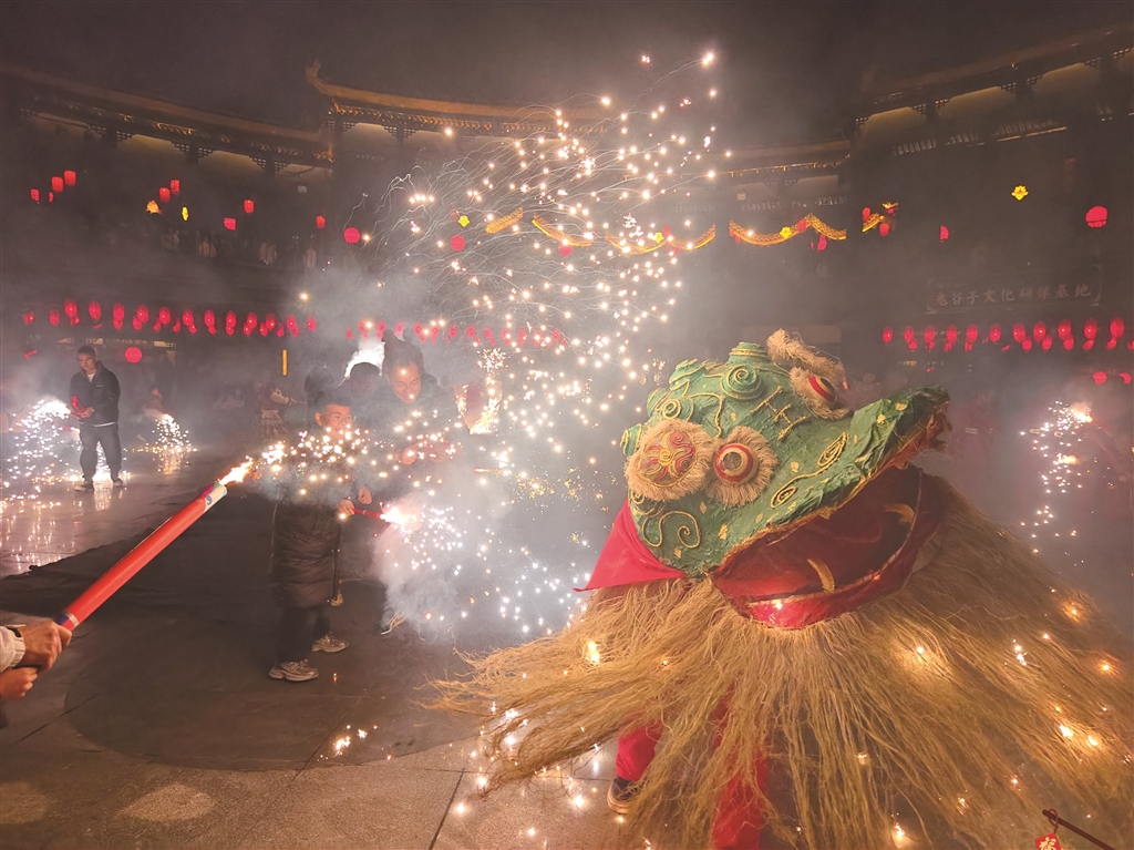 2月19日,石泉縣秦巴風(fēng)情園里的“燒獅子”引得眾人圍觀。舞獅人配合默契,游客點(diǎn)燃煙花筒,現(xiàn)場火花四濺、氣氛熱烈。楊勇 攝