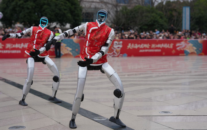 2026年2月28日,宇樹科技人形機器人在浙江省桐廬縣中心廣場表演舞蹈。新華社記者 黃宗治 攝