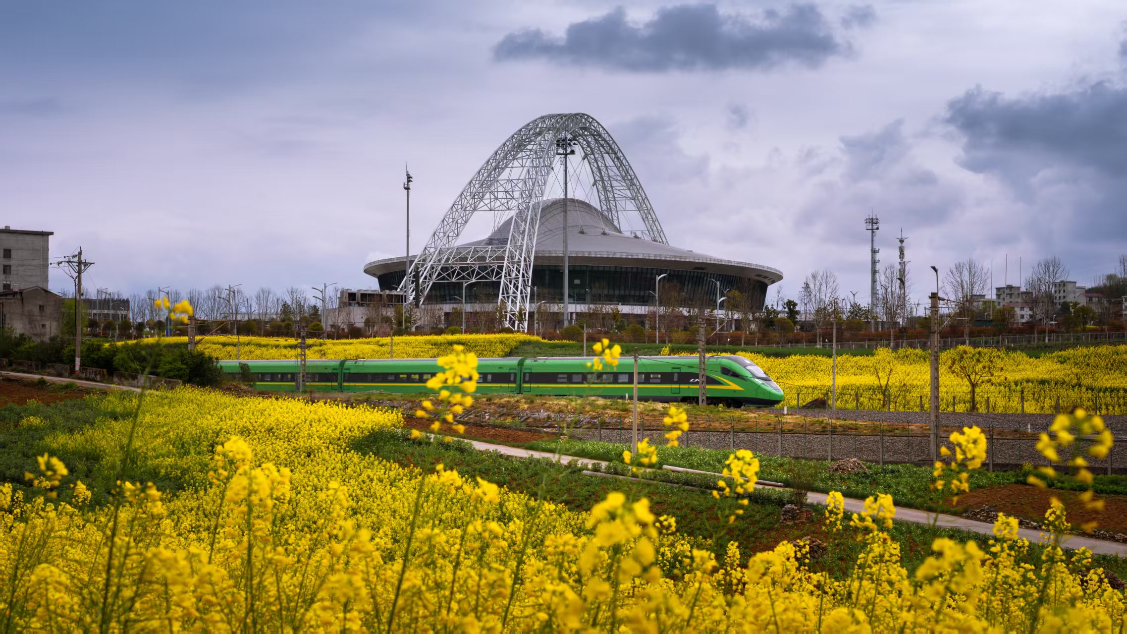 3月16日,安康市體育館前,金黃的油菜花海與飛馳的復(fù)興號列車相映成趣,盡顯春日生機。王坤侖 攝