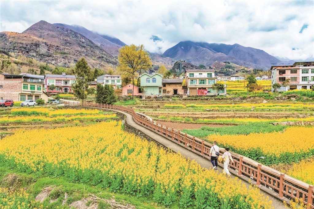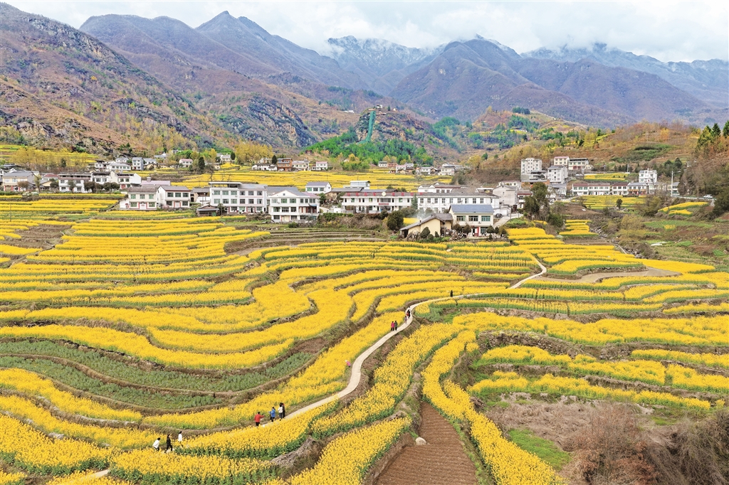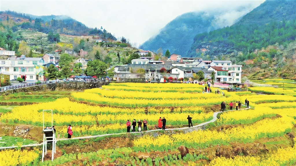 層層疊疊的油菜花,吸引游客花田踏青。